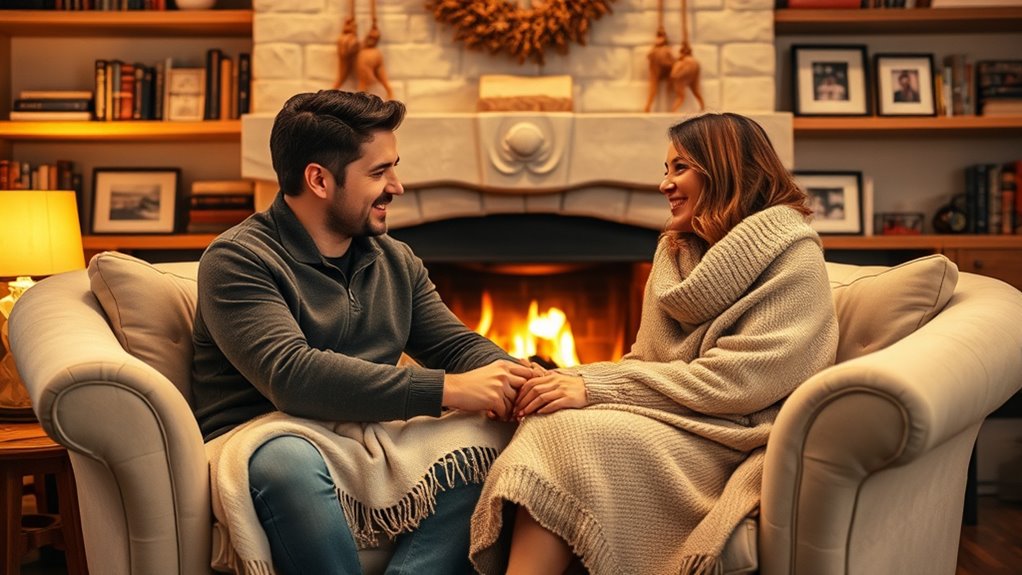 A stitch in time saves nine — during conflicts, stay calm and focus on trust building. You can maintain emotional intimacy by practicing emotional vulnerability, sharing your feelings honestly without blame. Listen actively to your partner’s perspective, validate their emotions, and avoid shutting down. This approach fosters trust, showing you’re committed to understanding each other, even in disagreements. Keep communication open, respectful, and compassionate to strengthen your bond through tough times.