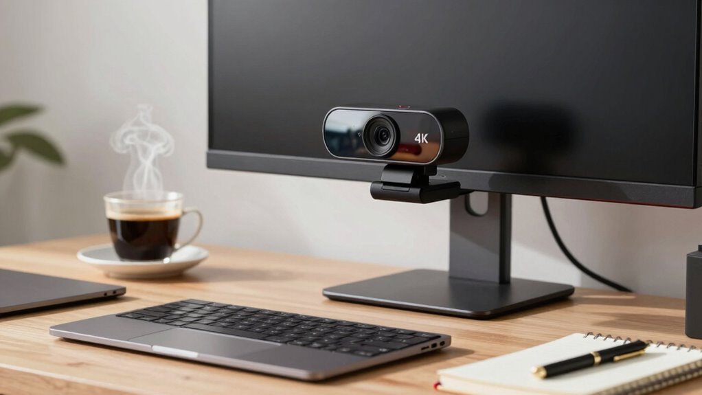 When selecting a 4K webcam for client calls, I focus on video quality standards and autofocus capabilities to guarantee sharp, professional images. I also look for built-in privacy features and compatibility with the platforms I use regularly. Finally, lighting adjustment options help me get a clear picture in different environments, making my calls look consistently polished.