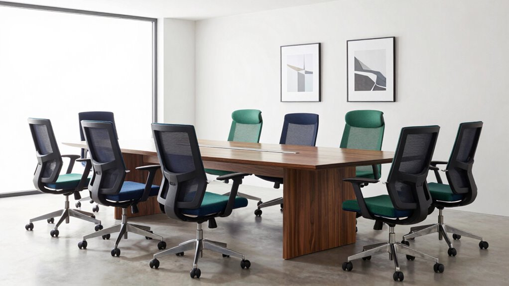 Maximizing space is key when outfitting a private practice office, especially if the area is limited. Space-saving ergonomic chairs often feature foldable or flip-up armrests, making it easy to tuck them under desks or store them when not in use. Their compact design, with adjustable height and tilt functions, guarantees a perfect fit in tight corners or small nooks. Chairs with slim bases and reduced footprints help maintain a clutter-free environment. Multi-functional features like retractable footrests or collapsible backrests add versatility without taking up extra space. Plus, easy-to-maneuver 360° swivel casters enable smooth movement in confined areas, optimizing your workspace layout. These features combine to create a functional, comfortable, and space-efficient office setup.