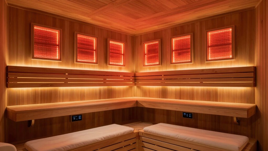 Lighting options in an infrared sauna play a crucial role in enhancing both relaxation and therapeutic benefits. Wellness-focused saunas often include chromotherapy lighting, offering multiple colors to boost mood and create a calming environment. LED systems can be customized with full-spectrum or specific wavelengths like red or blue, targeting particular health benefits. Adjustable lighting features allow me to set a soothing ambiance that complements my wellness routine, whether I’m relaxing or meditating. Some saunas even come with built-in reading lights or soft-glow LEDs, making it easier to read or focus during sessions. The quality and variety of these lighting options greatly influence the sauna’s aesthetic and therapeutic atmosphere, allowing me to tailor my experience for maximum relaxation and health benefits.