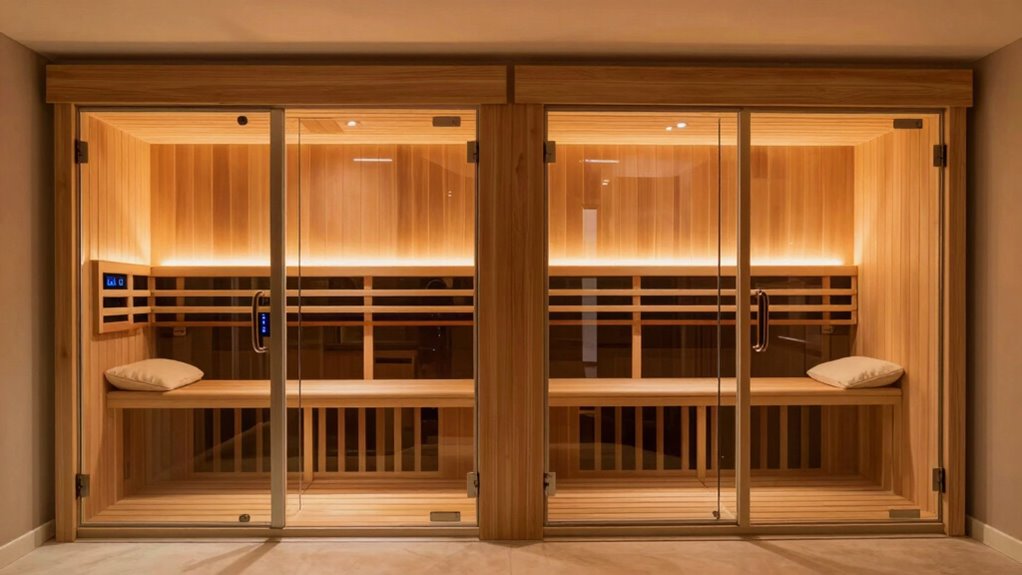Infrared saunas utilize various heating technologies, each offering unique advantages that can considerably impact your experience. Near-infrared (850nm) penetrates the skin more deeply, promoting cellular repair and skin rejuvenation, while far-infrared (around 9.4 microns) is excellent for detoxification and muscle relaxation. Some saunas use low EMF carbon panel heaters, which emit minimal electromagnetic fields, making them safer for prolonged use, especially for sensitive individuals. Traditional heaters often incorporate ceramic or carbon elements, with carbon panels providing even heat distribution and lower surface temperatures. The efficiency of these technologies affects session duration and energy consumption—some models heat up faster and offer adjustable temperature controls for personalized comfort. Choosing the right technology depends on your specific health goals and safety preferences.