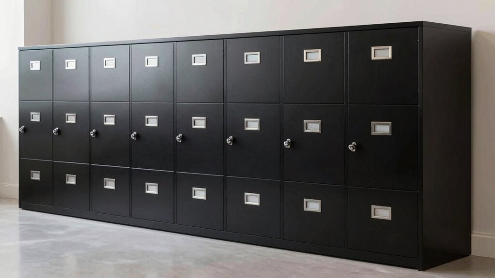 Choosing a locking file cabinet requires careful attention to security features that can genuinely protect sensitive documents. Effective locking mechanisms, like key or combination locks, are vital for preventing unauthorized access. Locking file cabinets with interlocking drawers ensure that only one drawer opens at a time, boosting security and safety. High-security features such as reinforced steel construction and tamper-proof locks provide extra protection against forced entry. Locking bars or padlocks that secure multiple drawers simultaneously offer extensive control over access. Additionally, certifications or security standards can help verify a cabinet’s reliability, giving you confidence in its security. Prioritizing these features guarantees your sensitive documents stay protected from theft or unauthorized viewing, making security an essential factor when choosing the right locking file cabinet.